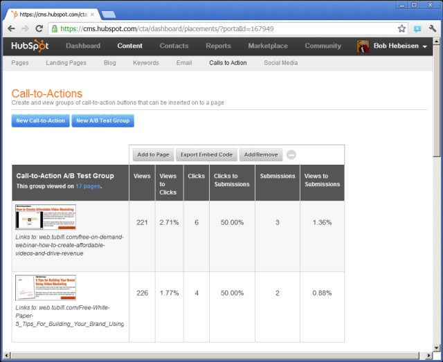 Here is HubSpot’s CTA dashboard showing the results of this A/B test. You can see that one banner is producing more clicks and more submissions.