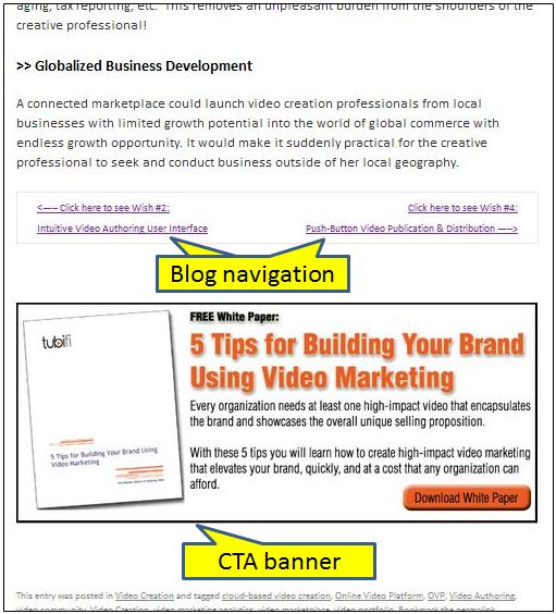 I was careful to also include a CTA banner at the bottom of each post to try to convert readers to leads. HubSpot has good CTA (“Call To Action”) functionality where you can test 2 or more offers against one another to see which one pulls better. Set it up in HubSpot, then paste the code onto any page, and then track the results. So you will see in the image that the CTA code generated by HubSpot is testing a banner for a free white paper vs. a banner for a free recorded webcast (FYI the white paper is pulling better on the blog but the webcast is pulling better on the home page).