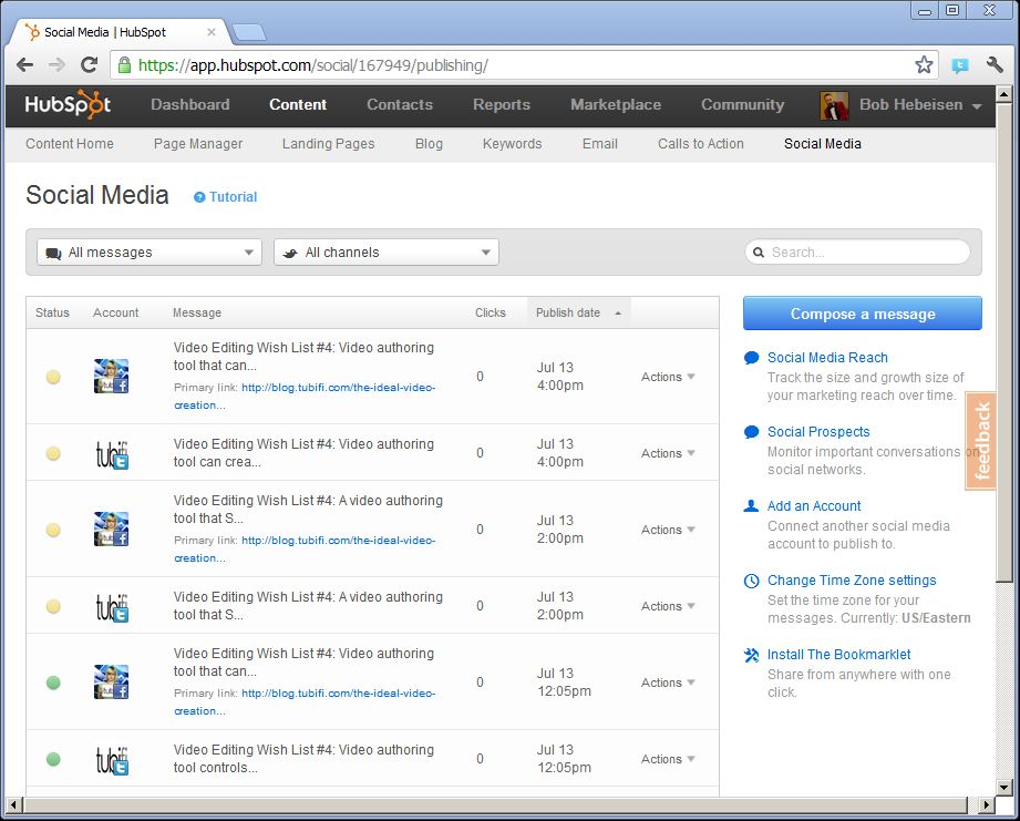The HubSpot Social Media Publishing tool shows you which messages have been scheduled (yellow light), which have been published (green light), and which have encountered errors (red light). It also tracks the number of click-throughs associated with the URL.